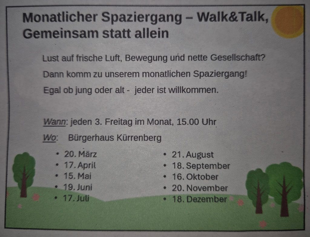 Aktuelles Walk & Talk 8. Februar 20268. Februar 2026 Monatlicher Spaziergang, Gemeinsam statt alleine.